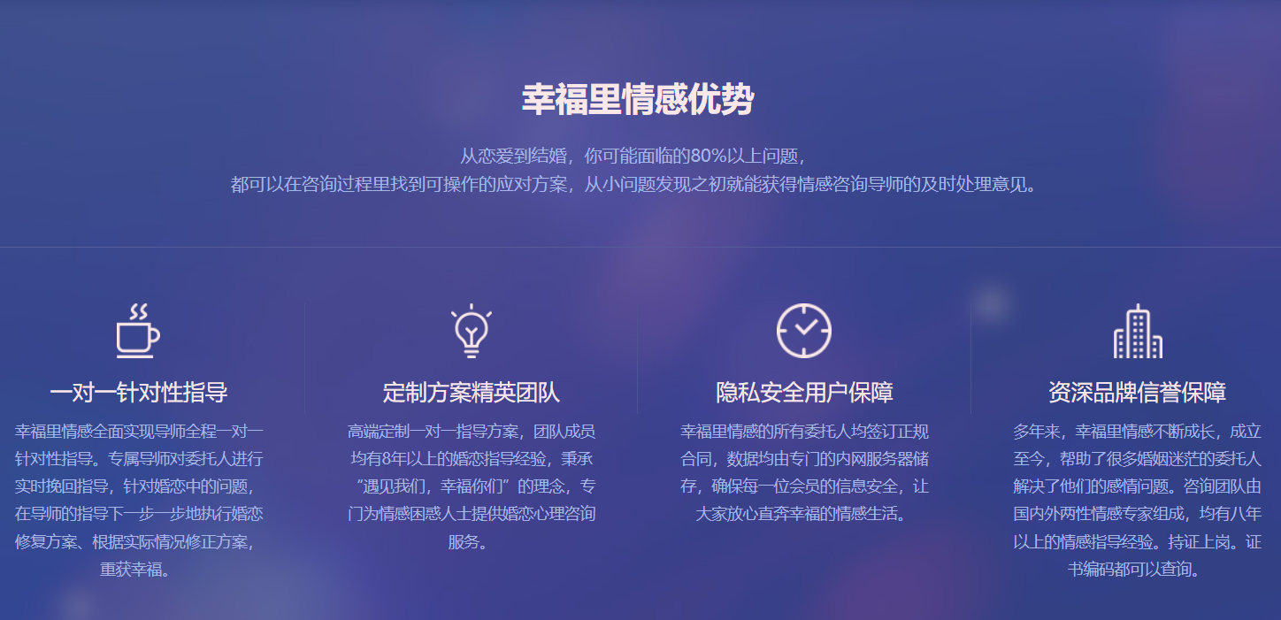 幸福家情感本着真诚、尊重、关爱的原则,专注于高效修复感情,分离小三,挽救婚姻,分居情变矫正、婚前辅导、自我提升等情感咨询服务。