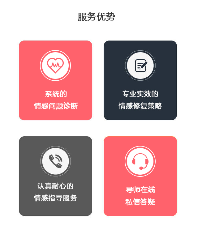 跟男朋友分手了,参加了辅导后,有多名导师开研讨会针对我的个人问题进行分析,制定出了一套很完整且适合我的方案,谘询导师很专业,很懂两性心理,总能说出我内心所想,从而给出最专业、最实用的建议,不管是对我的情场,还是职场,都有很大的帮助!真的很感谢老师